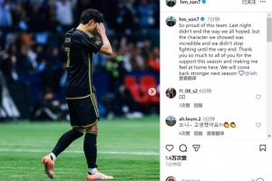 此役孙兴慜梅开二度,点球大战射失,最终遗憾落败,他在社交媒体上写道:“为球队感到非常骄傲,昨晚比赛的结果并非我们所愿,但我们展现了难以置信的韧性,战斗到最后一刻。”